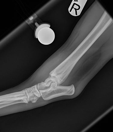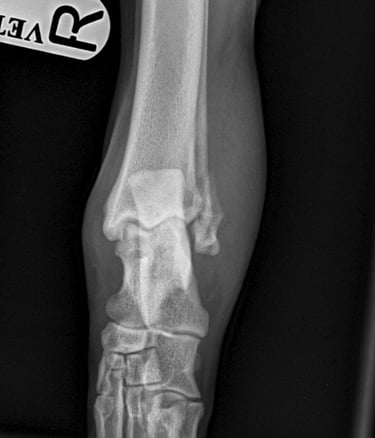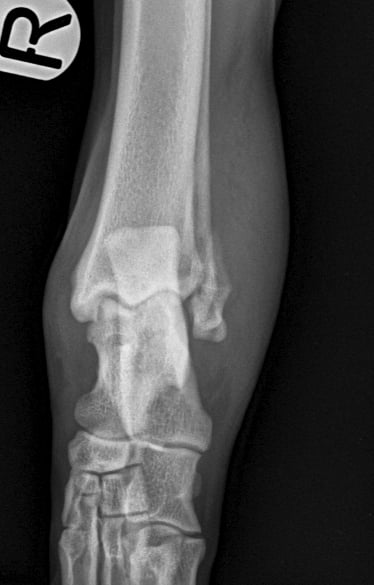 According to the owner Buddy was playing with a ball, jumped up and landed funny. On physical examination pain and severe swelling is detected over right tarsus, specially on lateral aspect, non-weight bearing lameness.