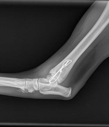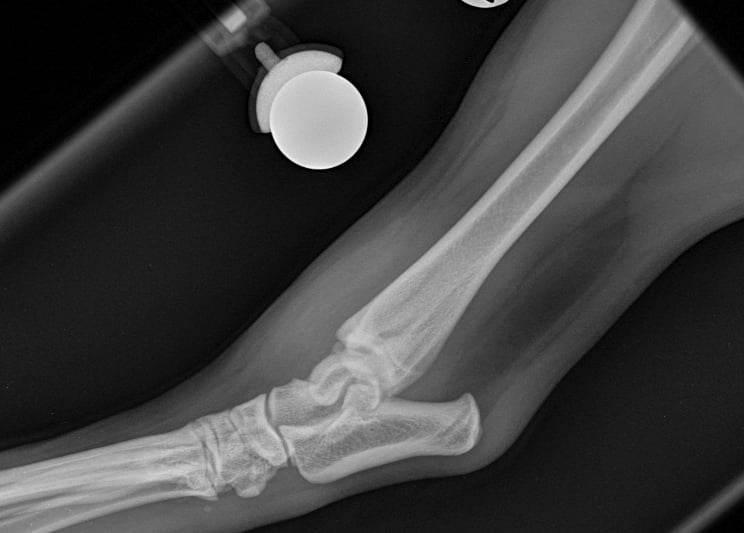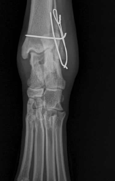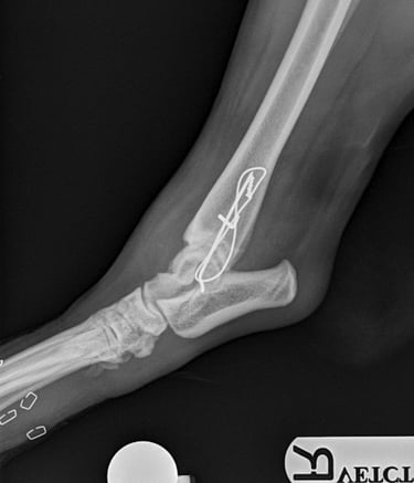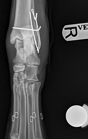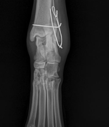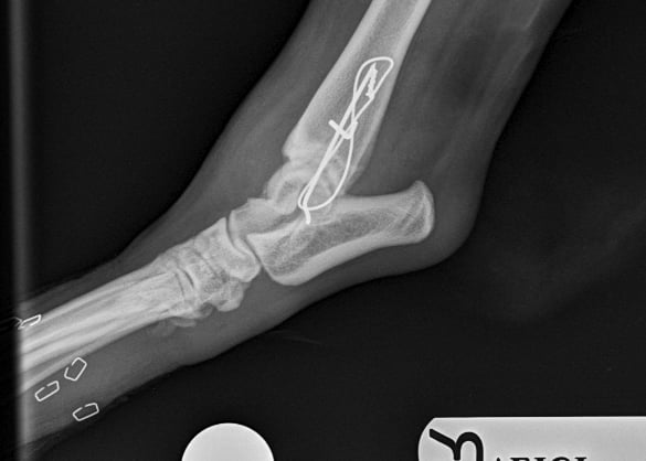 Lateral approach to the talocrural joint reveals severe oedema and bruising, 1.2mm IM pin placed in a distal to proximal fashion, 0.75mm cerclage wire used to create a figure-of-8 tension band. 1.4mm pin placed parallel to the talocrural joint from lateral to medial (Fig 3 and 4).