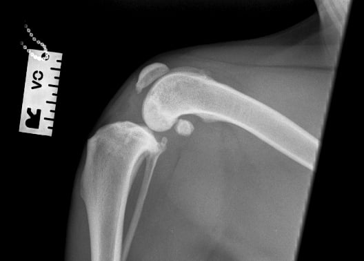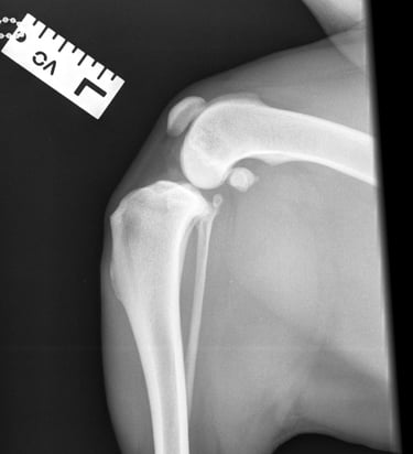 Luna presented with acute, severe lameness in her right pelvic limb following vigorous activity chasing a ball. On physical examination, there was localized pain and swelling at the right stifle joint.