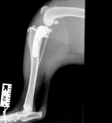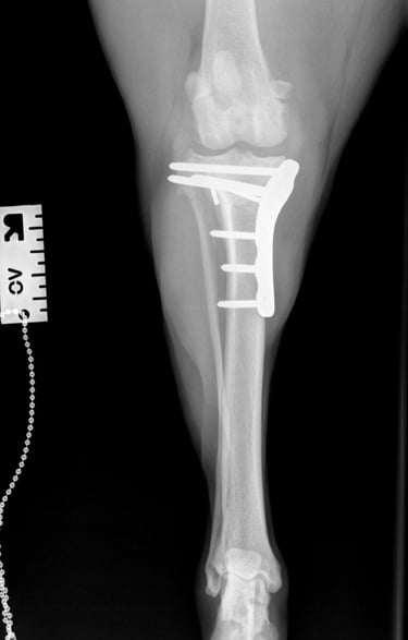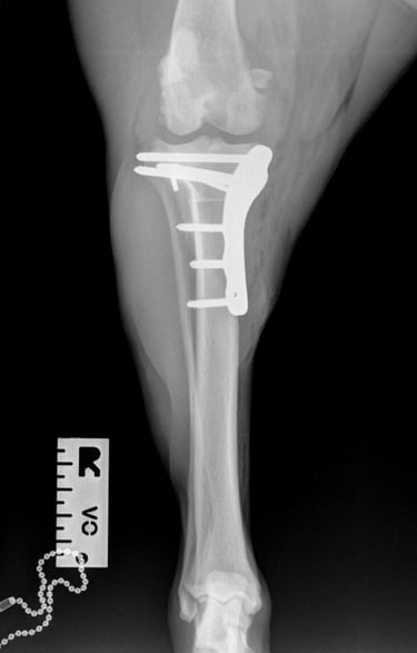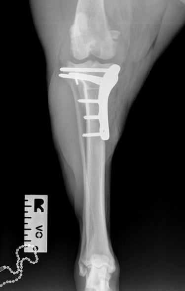 At the first postoperative recheck (day 3), Luna was nearly fully weight-bearing with only mild lameness. The surgical site showed excellent healing and 6 weeks post-op xrays (Figs. 7 and 8) show good ossification of osteotomy line and good position of implants.