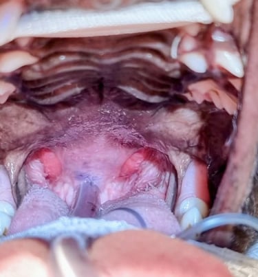During induction, the soft palate was observed to be markedly elongated, extending cranially beyond the epiglottic cartilage and causing near-complete obstruction of the laryngeal inlet, severely compromising airflow.