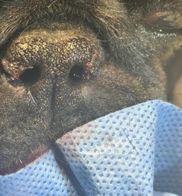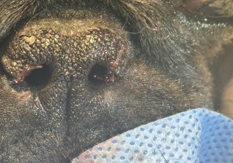 Bleeding was minimal and controlled easily. Closure was completed using simple interrupted sutures, with two stitches placed in the internal ventral nasal mucosa for optimal aposition and symmetry.