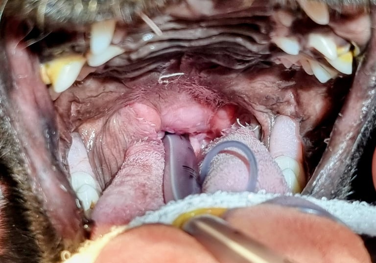 Following the staphylectomy, the laryngeal inlet was visibly clear, with the endotracheal tube no longer surrounded by the soft palate (Fig. 4)